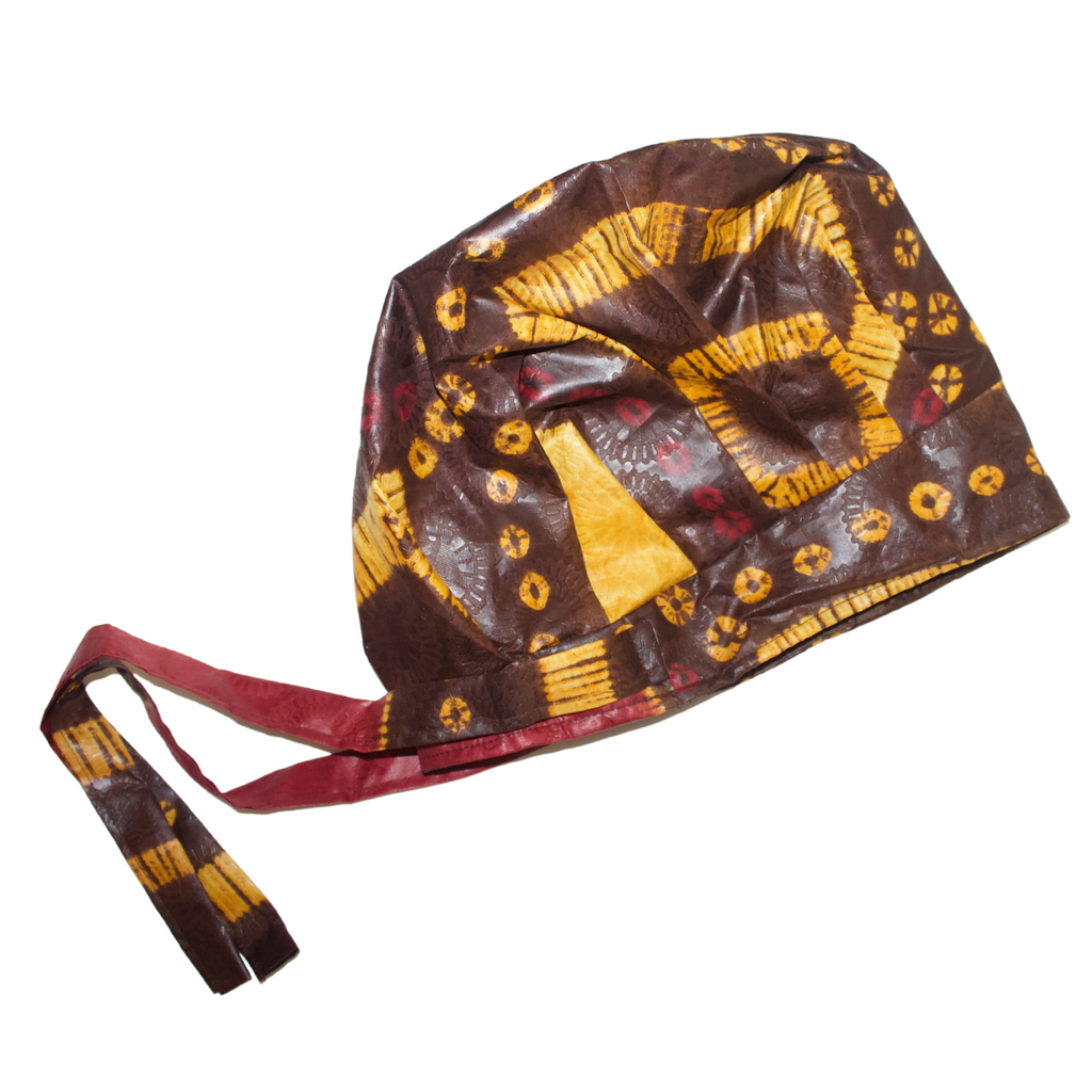 Fun, stylish, comfortable, satin-lined cloth scrub bonnet with fabric ties. Protect your hair while you work. The silky satin lining keeps your hair moisturized while the exterior is made from beautiful, vibrant African Adire fabric.